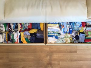 このソファベッドの引き出し、むちゃくちゃ入ります。リビングにこれだけの収納が増えるのはかなり便利です。我が家では、長男のシーズン中の服、保育園の持ち物(タオル、エプロン等)はすべてここに入っています。朝、保育園の荷物を準備し、着替えさせるときに、リビングから動かずに用意が完結するのは、一瞬で準備が終わります。